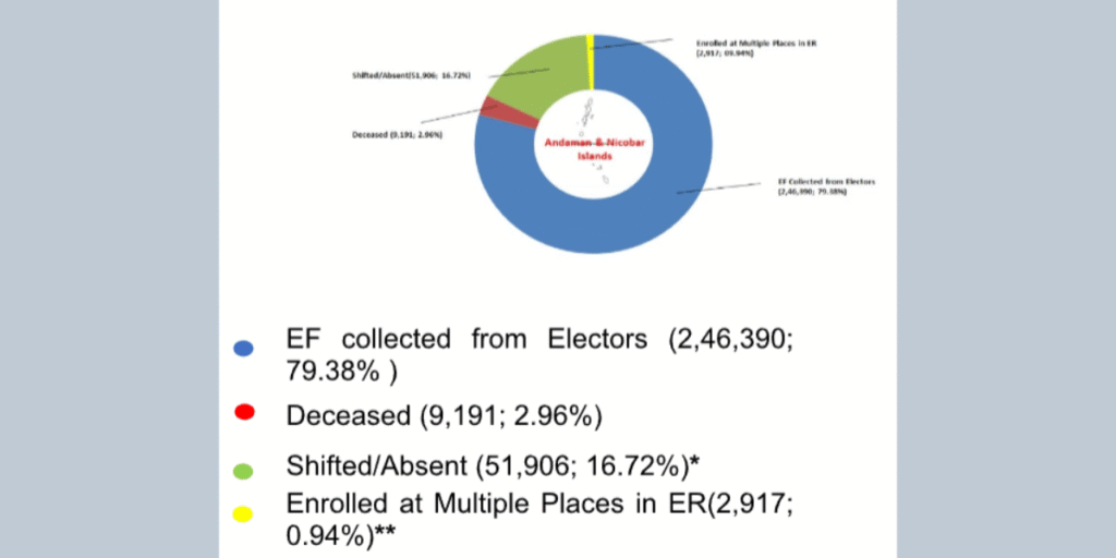 The Special Intensive Revision (SIR) of Electoral Rolls with reference to January 1, 2026, has reached a key milestone in the Andaman and Nicobar Islands, with enumeration forms collected from more than 79 per cent of electors during the first phase, according to data released by the Election Commission of India (ECI). The draft electoral roll was formally published on December 23, marking the beginning of the claims and objections phase that will continue until January 22, 2026.