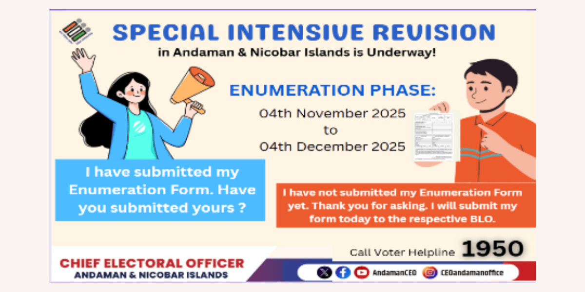 The Office of the Chief Electoral Officer (CEO), Andaman & Nicobar Islands, has urged all electors across the Islands to promptly submit their duly filled Enumeration Forms to their respective Booth Level Officers (BLOs) as part of the ongoing Special Intensive Revision of the electoral roll. The revision is being conducted with reference to January 1, 2026, as the qualifying date.