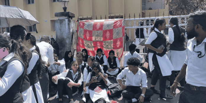 M. Vignesh, a third-year B.A. LL.B student, said the protest began after first-year students were informed that the college is no longer affiliated with Pondicherry University but with a newly established Deemed University in the Andaman and Nicobar Islands. According to him, the first-year batch had taken admission under Pondicherry University affiliation and had already completed their first-semester examinations under that university before the shift was communicated.