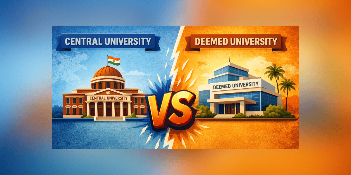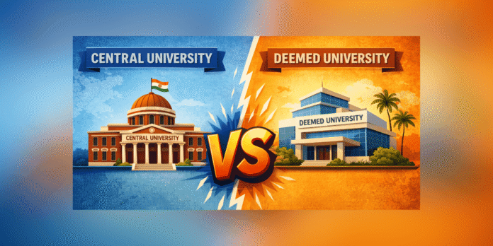 India’s higher education system recognises both Central Universities and Institutions Deemed to be Universities under the University Grants Commission (UGC) Act, 1956. Both categories award legally valid degrees and operate within the same national regulatory framework. However, they differ significantly in how they are established, funded and governed.
