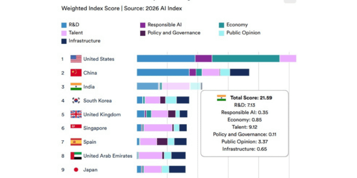 India has emerged as a global leader in artificial intelligence adoption, topping international rankings in AI skills diffusion and AI hiring, according to the 2026 Global Vibrancy Index (GVI) by Stanford University’s Institute for Human-Centred AI. Only the United States scores higher in economic competitiveness, placing India third overall behind the US and China.